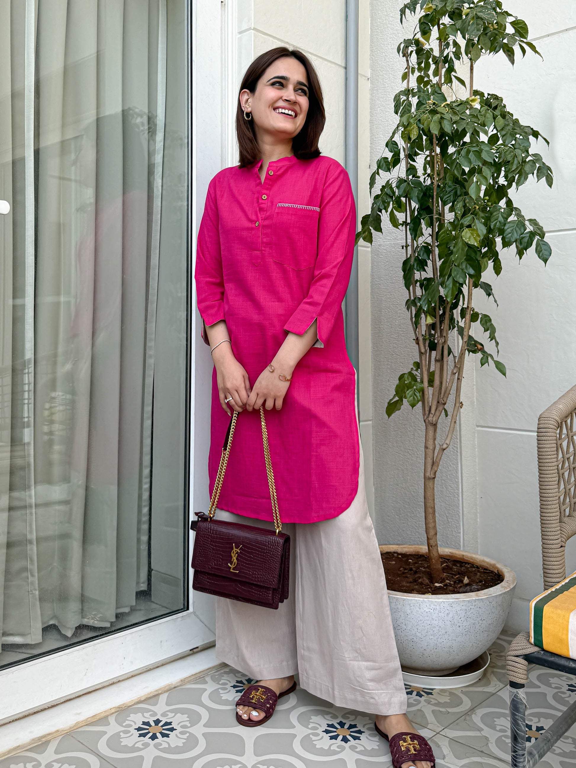 Upgrade your wardrobe with this stylish women’s cotton co-ord set, featuring a vibrant pink cotton slub kurta paired with elegant beige cotton flex pants. The kurta comes with a straight cut, three-quarter sleeves, and a neat neckline, offering comfort with a touch of sophistication. The breathable cotton fabrics make this co-ord set perfect for daily wear, office, or casual outings.
