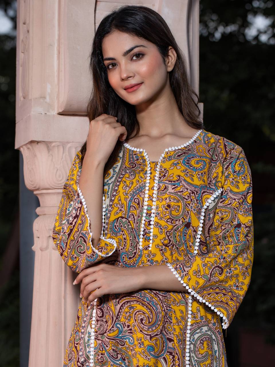 Women Self Design Cotton Pure Pakistani Long Kurta (Yellow)